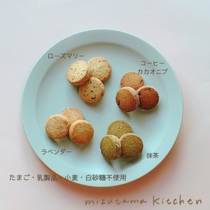 米粉(米〈福岡産〉)、アーモンドパウダー、甜菜糖、菜種油、甜菜糖、有機ココナッツオイル、菜種油、タピオカ粉、有機コーヒー、有機カカオニブ、ローズマリー、有機ラベンダー、有機抹茶、食塩、アルミフリーベーキングパウダー